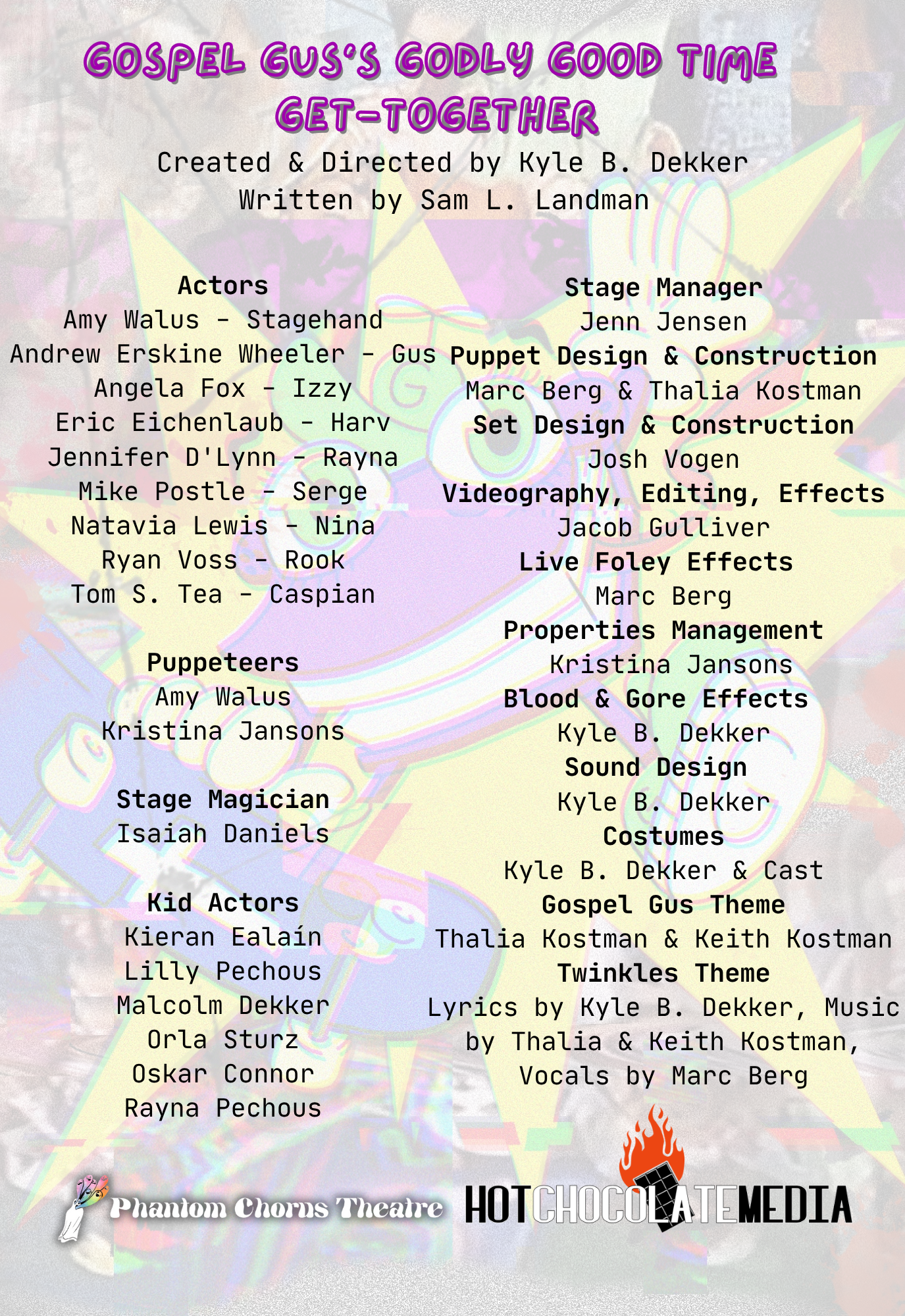 Kyle B. Dekker is a jack of most trades theater professional in the Twin Cities. He’s produced and worked on several original world premier shows for the Minnesota Fringe and Twin Cities Horror Festival and beyond. This is his second show working with Phantom Chorus Theatre in 2025 ("Dealing with Dragons")! His solo storytelling shows have toured in five states and he was the recipient of the 2023 Elgin Fringe Festival Chris & Kathleen Mau Spirit of the Fringe Award. His work has been described "High concept, but incredibly low brow." He can't wait to unleash part of his childhood nightmares onto audiences this year with Gospel Gus!